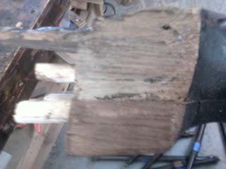 The color difference in the wood on the bottom half of the photo is the new Walnut that was glued to the old to make the repair above.